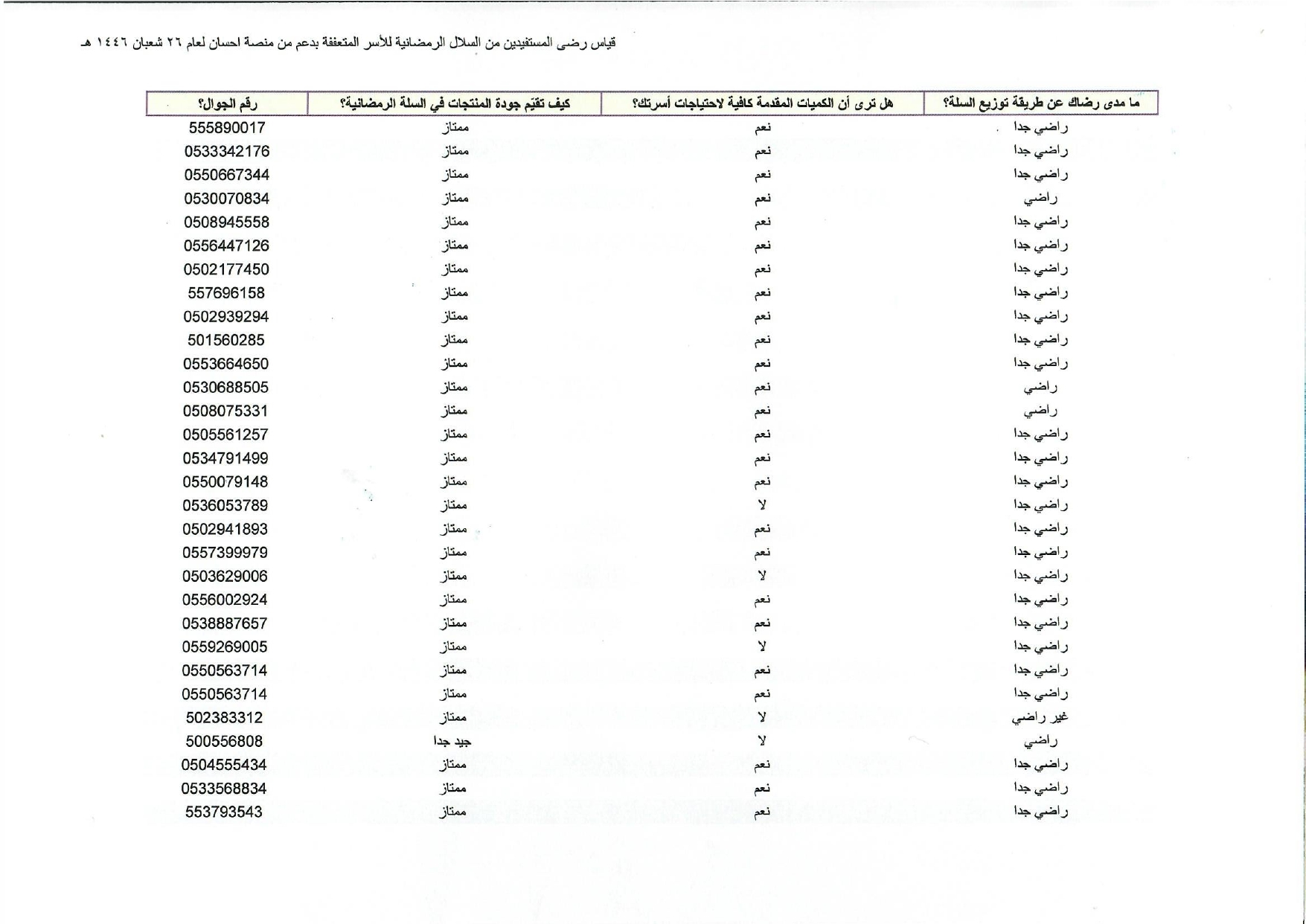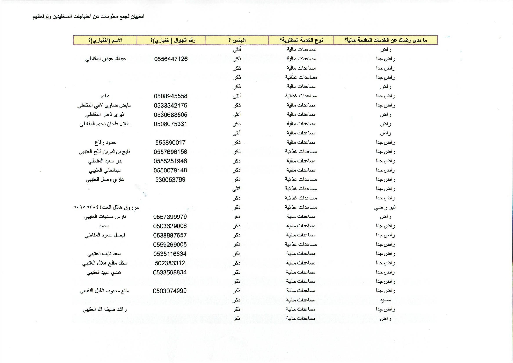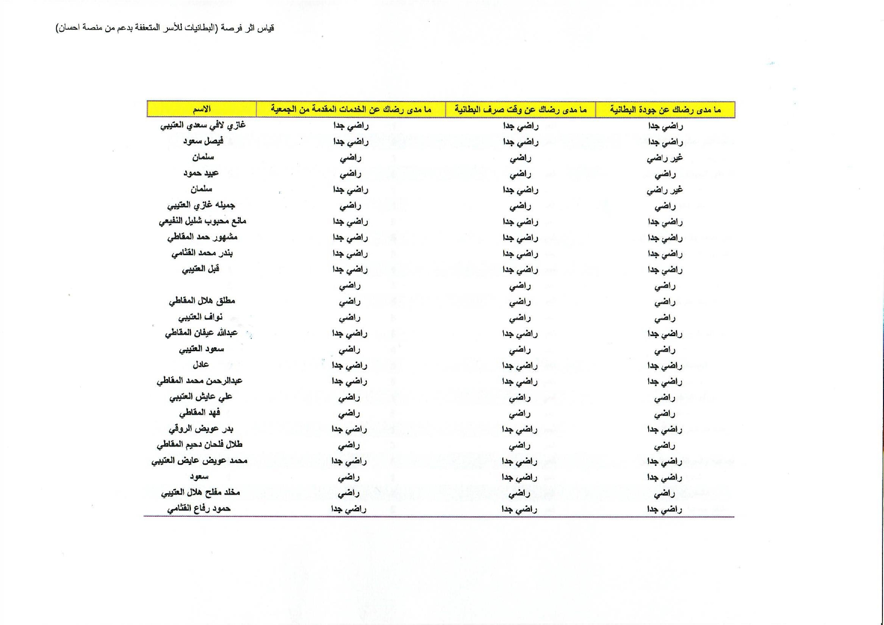 التغذية الراجعة التغذية الراجعة من عمليات التقييم على منصات الجمعية الإلكترونية قياس رضى المستفيدين من السلال الرمضانيةpdfعرض استبيان لجمع معلومات عن احتياجات المستفيدين وتوقعاتهم pdfعرض قياس اثر فرصة (البطانيات للأسرpdfعرض